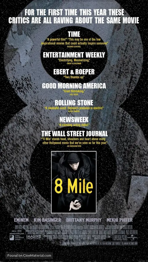 ∣8 Mile [Full Movie]: 8 Mile Original Cinema Movie Poster From Pastposters Com British Quad Posters And Us 1 Sheet Posters 8 Mile [Full Movie]→: 8 Mile Movie Cover 〖#123Film@〗 aka (街头痞子, 8 Mile: Calle de ilusiones, 8 mile (Eminem), Восьмая миля, 8 milya, Osmata milya, Calle de las ilusiones, Vosʹma mylya, 8 milja, 8마일 2002) "The setting is Detroit in 1995. The city is divided by 8 Mile, a road that splits the town in half along racial lines. A young white rapper, Jimmy "B-Rabbit" Smith Jr. summons strength within himself to cross over these arbitrary boundaries to fulfill his dream of success in hip hop. With his pal Future and the three one third in place, all he has to do is not choke." film genres: Music, Drama.